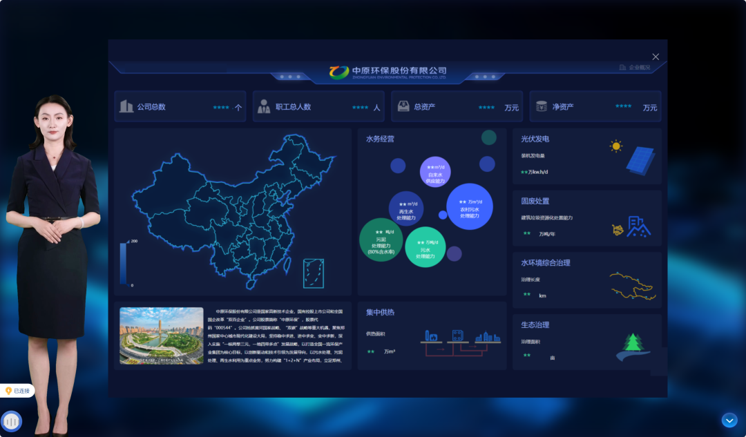 管理服务更加便捷。依托智能体、大模型等数字技术,构建公司智能平台,集成数字人交互、业务知识问答、大模型及业务系统功能调用等服务。以马头岗水务为试点,打造 AI 智能巡检体系,实现AI 视频识别、振动监测、线上巡检、数据采集等核心功能。