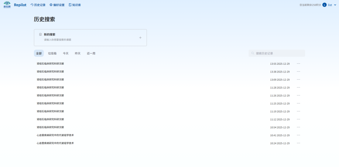 多个来自浙江三甲医院的医生,刚体验完Repilot的新功能,就忍不住分享这份“惊喜”。在2025云栖大会上,迪安诊断(300244)发布了科研文献智搜智能体——Repilot,近日,Repilot升级版正式亮相。本次升级聚焦“学术研究更高效、成果质量更可靠、科研资产更持久”的核心宗旨,采用扁平化界面设计让操作路径更直观,整合了功能入口,常用操作步骤减少40%,让研究者告别“低水平重复”,回归创新本源,推动医学科研智能化跃升。