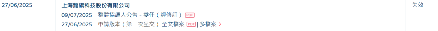龙旗科技(603341)(603341.SH)于6月27日所递交的港股招股书满6个月,于12月27日失效,递表时花旗、海通国际、国泰君安国际为联席保荐人。