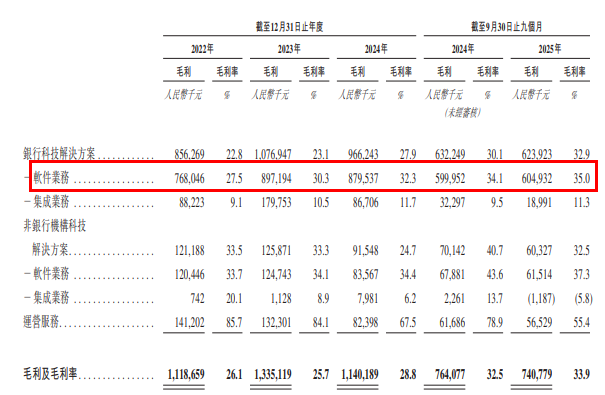 不过宇信科技集中资源于高价值项目的策略,也的确改善了公司的盈利状况。数据显示,2022-2025年前9月,宇信科技的综合毛利分别达到了11.19亿元、13.35亿元、11.4亿元、7.41亿元,对应毛利率26.1%、25.7%、28.8%、33.9%,呈现出明显的改善趋势。而在这背后,银行科技解决方案板块里的软件业务毛利率大幅优化便是引起这一积极变化的最主要因子。2025年前9月,该业务的毛利率升至35%,较2022年的27.5%大幅抬升。