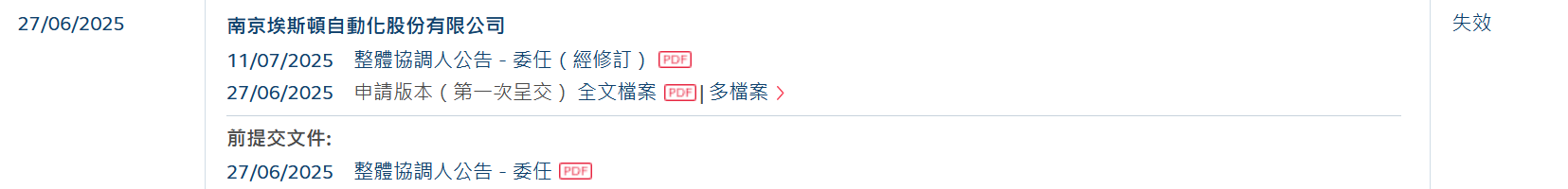 南京埃斯顿(002747)自动化股份有限公司(简称:埃斯顿)于6月27日所递交的港股招股书满6个月,于12月27日失效,递表时华泰国际为独家保荐人。
