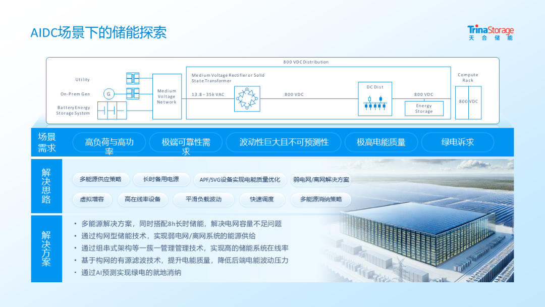 在面向AIDC等高新用电场景方面,也展现出前瞻性的系统融合能力。天合储能推出了“多能源供应+长时储能+智能调度”绿色综合能源解决方案,高度契合“稳定保供、灵活部署、负荷波动”的典型用电特征,可助力构建高效、低碳、高可靠的算力基础设施,增强电网电压支撑与故障穿越能力,保障算力中心用电稳定。