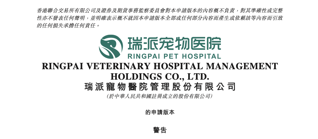 2025年12月22日,来自天津的瑞派宠物医院管理股份有限公司 RINGPAI VETERINARY HOSPITAL MANAGEMENT HOLDINGS CO., LTD.(以下简称“瑞派宠物医院”)在港交所递交招股书,拟香港主板IPO上市,中金公司担任独家保荐人。