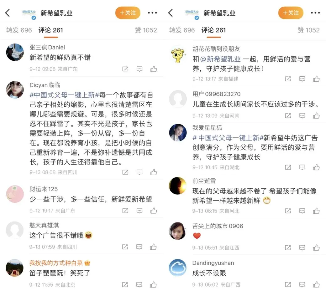 在#中国式父母一键上新#微博话题下,不少网友纷纷留下自己的影评,有人说:“(《中国式新鲜》)不像讲故事,倒像是在颅内放烟花。”还有不少为人父母的网友表示:“这短片给我提供了带娃新灵感”,用户自发参与讨论,品牌悄悄走进心里。