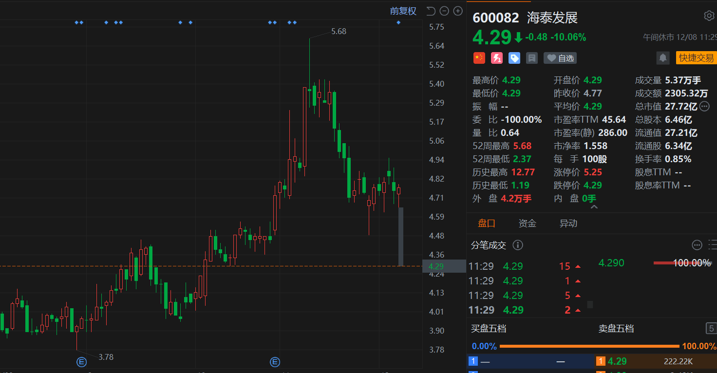 终止重大资产重组,海泰发展跌停,创阶段新低