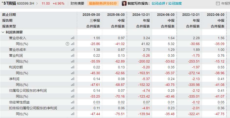 业绩方面,*ST熊猫今年前三季度实现营业收入1.55亿元,同比下降25.86%;归属于上市公司股东净利润为1356.01万元,同比下降53.25%。
