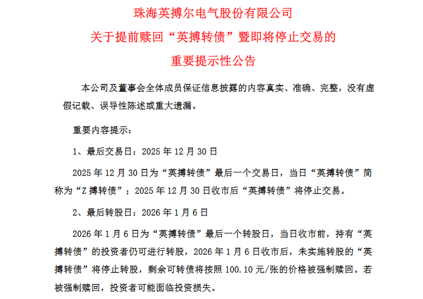 英搏尔(300681)发布关于提前赎回“英搏转债”暨即将停止交易的重要提示性公告,提醒投资者2025年12月30日为英搏转债最后一个交易日,2026年1月6日是最后一个转股日,债券持有人应及时卖出或转股。2026年1月6日收市后,未实施转股的英搏转债将全部冻结,停止交易和转股。