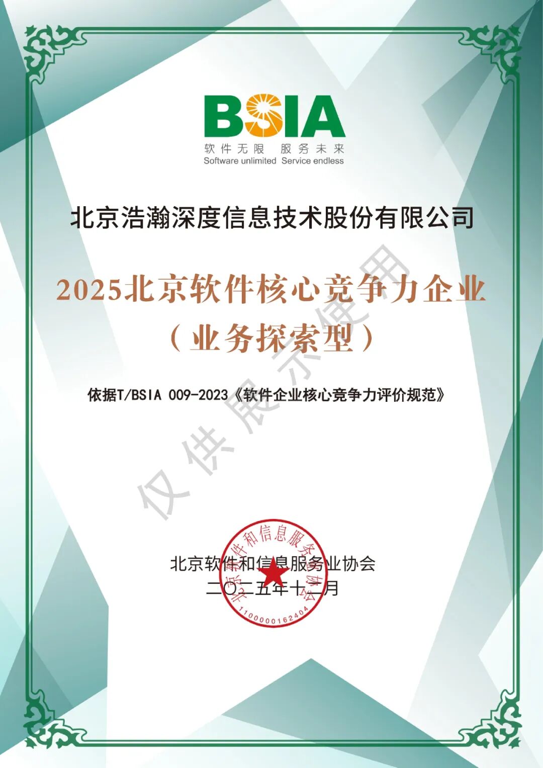 浩瀚深度公司连续5年获评“业务探索型”核心竞争力企业,标志着在在数据智能处理、行业解决方案创新、技术研发投入及业务模式探索等方面的突出表现获得权威肯定,也凸显了企业在把握行业发展趋势、挖掘市场新机遇。