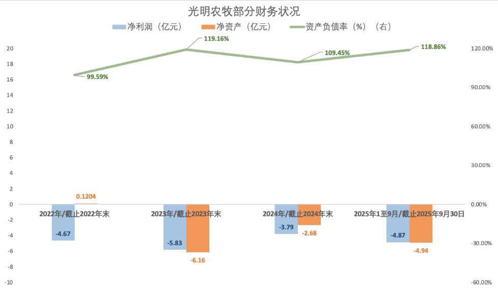 资产方面同样难言乐观。一方面,光明农牧资产负债率居高不下,截至2022年末、2023年末、2024年末以及2025年9月30日前述指标分别达99.59%、119.16%、109.45%和118.86%;另一方面,自2023年起,该子公司净资产由正转负,截至2023年末和2024年末及2025年9月30日,前述指标分别为-6.16亿元、-2.68亿元、-4.94亿元,已资不抵债。