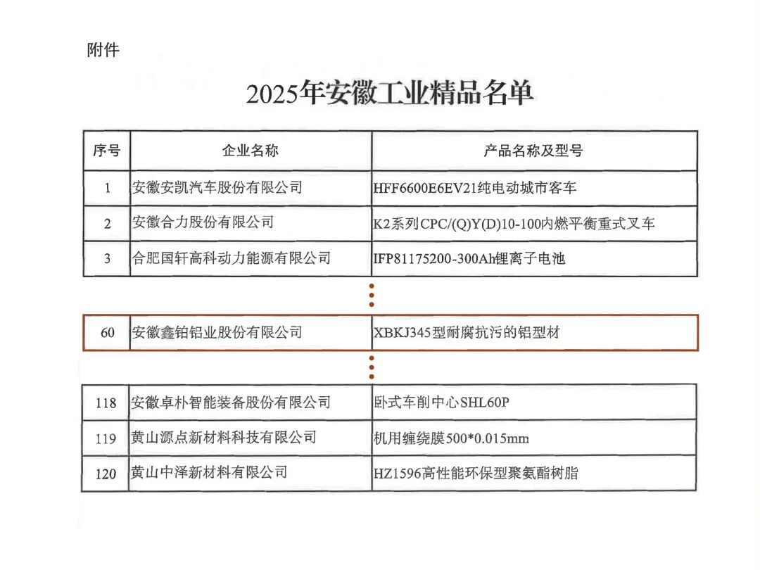 本月,安徽省工业和信息化厅公布2025年度“安徽工业精品”名单,安徽鑫铂铝业股份有限公司自主研发的 XBKJ345型耐腐抗污的铝型材 成功入选,成为公司在高端工业材料领域的又一重要里程碑。