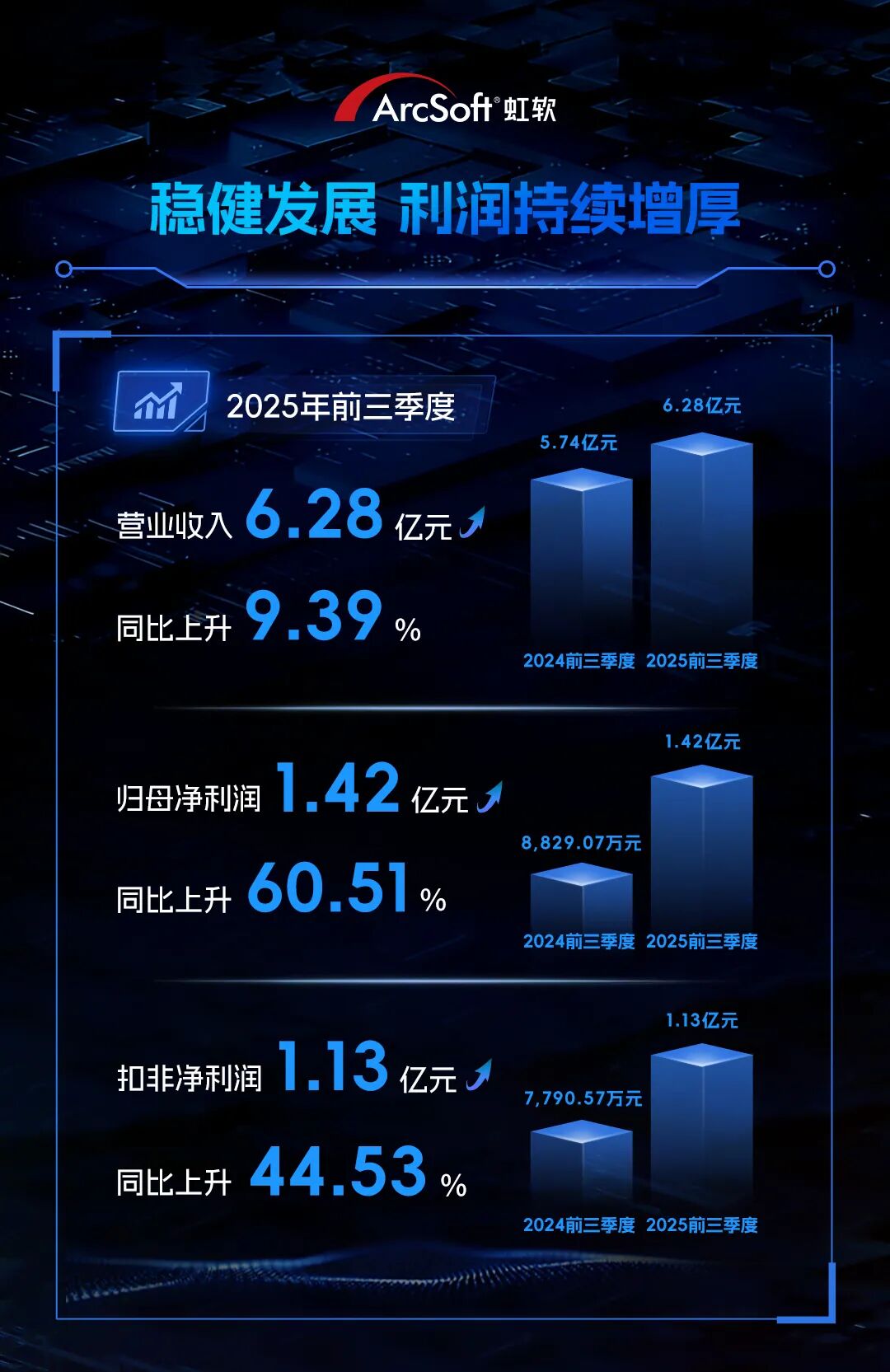 2025年,虹软深耕垂直领域、持续突破,前三季度的报表数据也呈现出稳健增长。成长不仅是数字的上升,更是行业伙伴、用户与市场对虹软的持续信任。