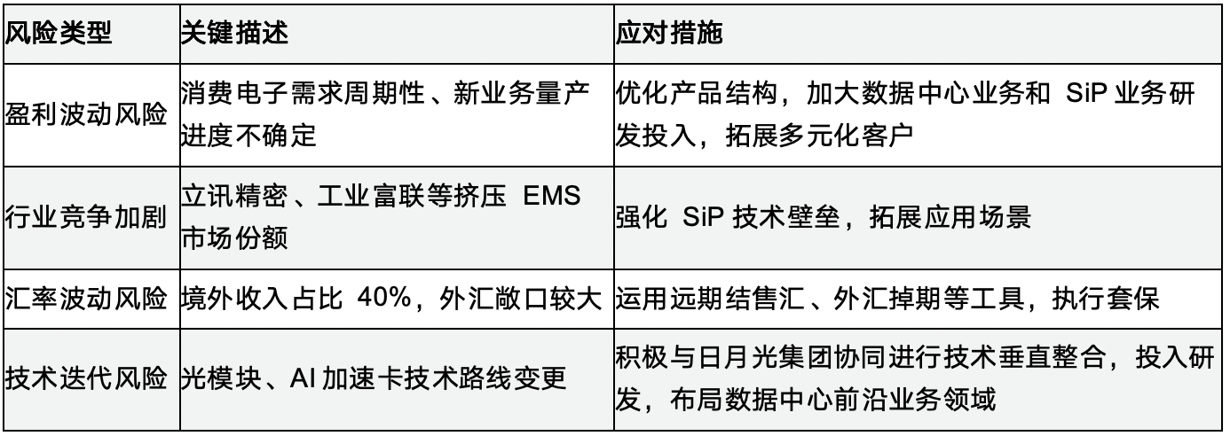 ● 股价与估值:2025年涨幅88.34%,远超电子制造服务行业平均(约35%);年末市盈率(TTM)40倍(年初18.93倍),高于行业均值(28倍),反映投资人对公司在数据中心业务和SiP业务上未来发展的信心。