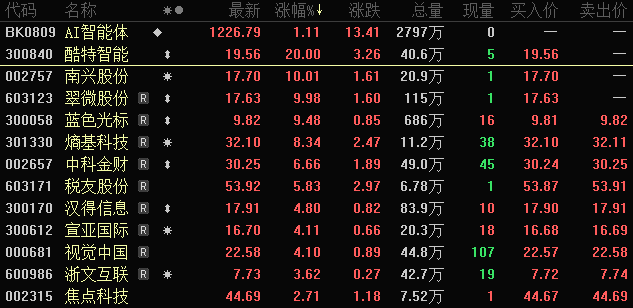 今日早盘,AI智能体相关概念股走强,其中酷特智能(300840)“20cm”涨停,南兴股份(002757)、翠微股份(603123)涨停,熵基科技(301330)、蓝色光标(300058)、中科金财(002657)等大幅上涨。