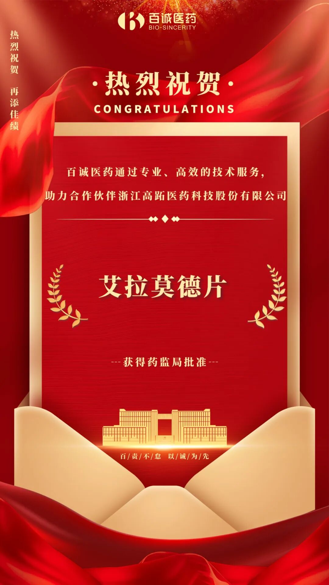 喜报!百诚医药助力合作伙伴艾拉莫德片获批!