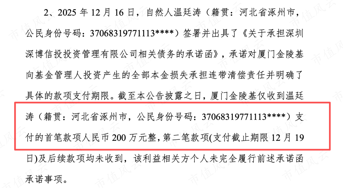除上市公司外,还有一个大冤种,就是公告里的温廷涛,一个跟私募公司无关紧要的自然人出来说要承担损失,然后先给上市公司打了200万。