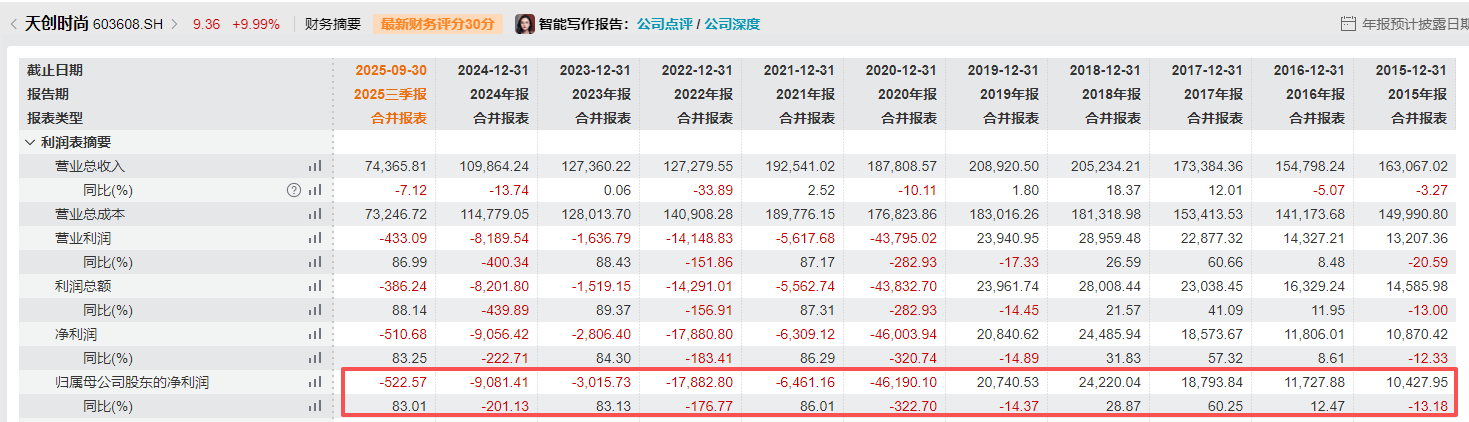 但从最新业绩数据来看,这份努力的成效并未完全显现。2025年前三季度,天创时尚实现营业收入7.44亿元,同比下降7.12%;但亏损大幅收窄,归母净利润由去年同期的-3.08亿元改善至-0.52亿元,经营效率显著提升。同时,经营活动现金流净额同比大增397.70%,经营性造血功能恢复。