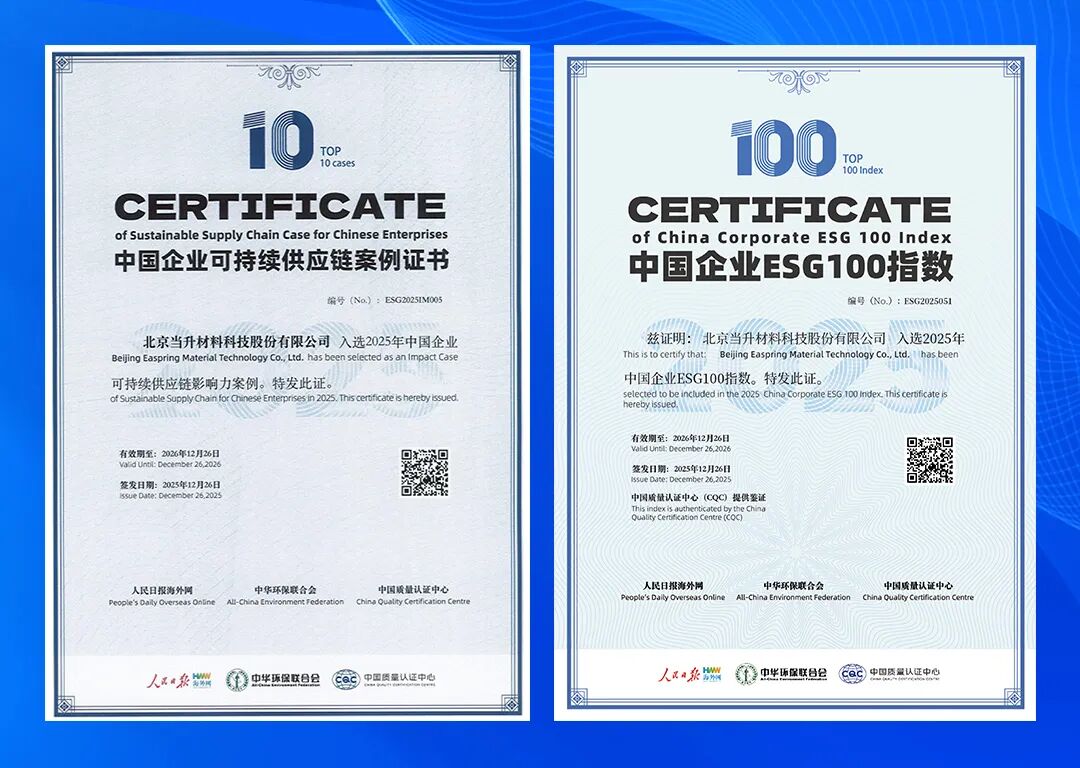 近日,由人民日报海外网、中华环保联合会和中国质量认证中心共同举办的第三届中国品牌形象海外传播论坛暨2025中国企业ESG蓝皮书发布会在人民日报社召开。当升科技(300073)凭借在科技创新、数字化建设和可持续供应链管理等方面的突出表现,成功入选“2025中国企业ESG100指数”,并获评“中国企业可持续供应链影响力案例”,相关实践被纳入《2025中国企业ESG蓝皮书》。