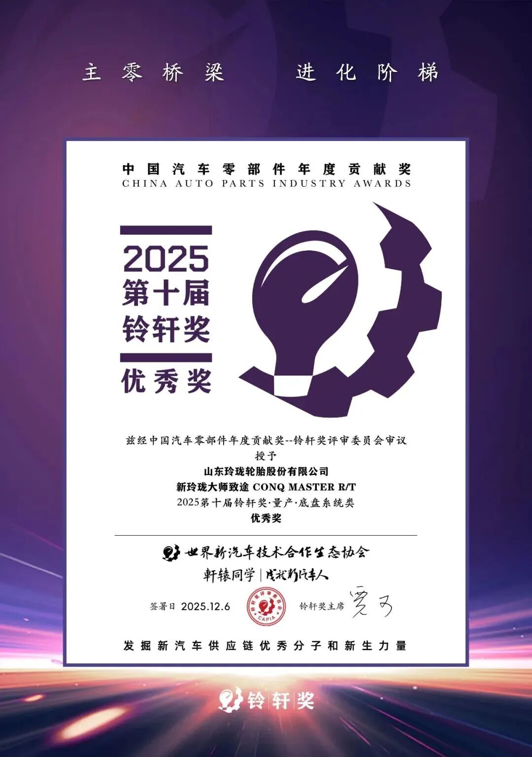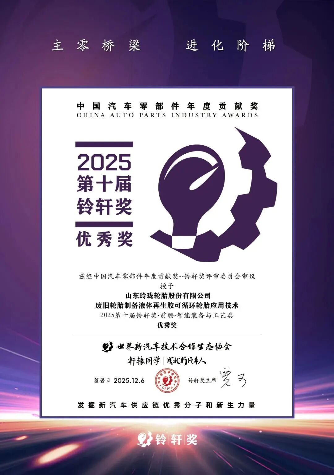 12月6日,第十届铃轩奖颁奖典礼在苏州揭晓。在为期半年、经过29位专家严格评审的激烈角逐中,玲珑轮胎(601966)从百余项申报中脱颖而出,斩获双项大奖:“废旧轮胎制备液体再生胶可循环轮胎应用技术”荣膺前瞻类优秀奖,“新玲珑大师致途”夺得量产类优秀奖。玲珑第六次成为该汽车零部件权威奖项唯一获奖轮胎企业,彰显了其持续领先的创新能力。