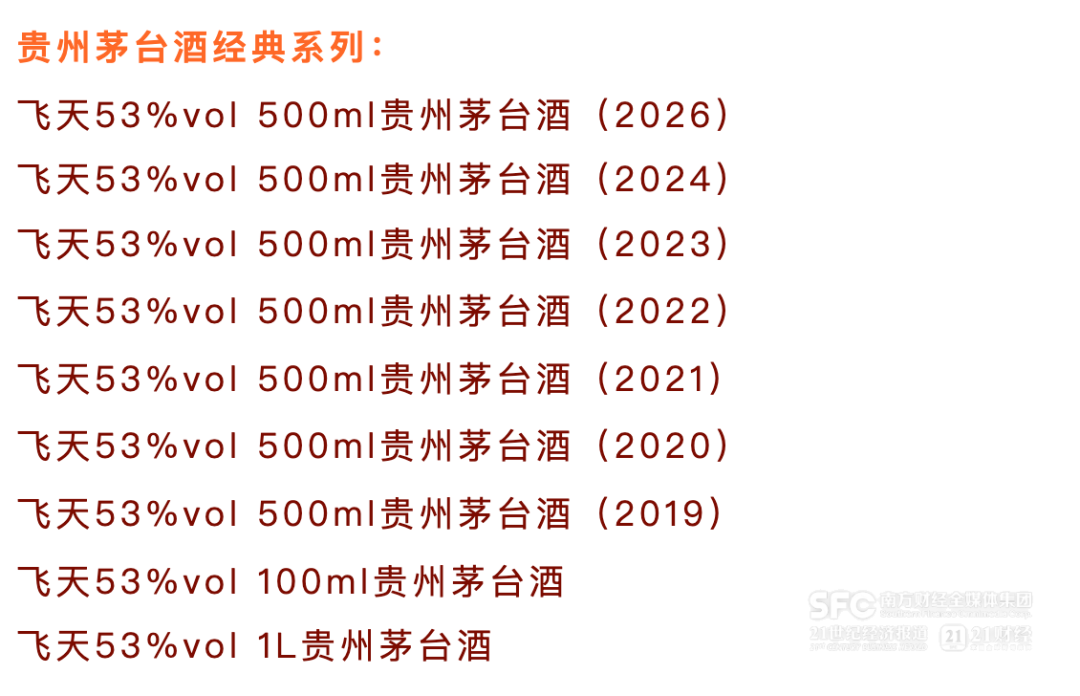 53度500ml贵州茅台酒,即大众口中的飞天茅台、普茅。值得注意的是,这将是53度500ml飞天茅台首次登上“i茅台”,并且不只是2026年的新飞天,还包括了2019年至2024年历年的次新飞天。这一大单品每年贡献了贵州茅台最多的收入。