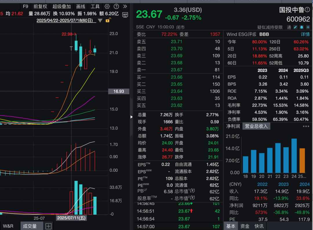截至12月30日收盘,国投中鲁股价报23.67元/股,市值为62.07亿元。