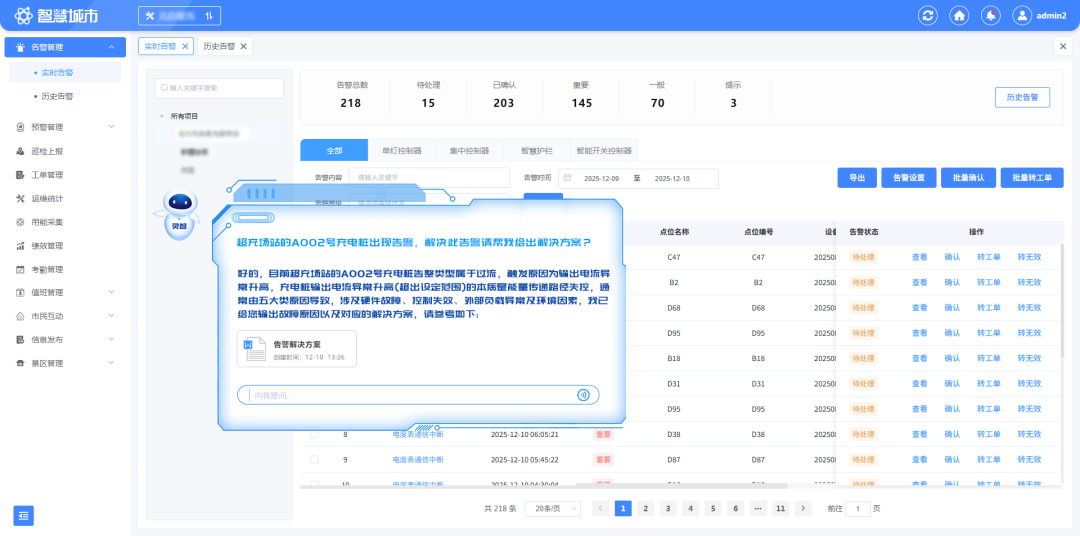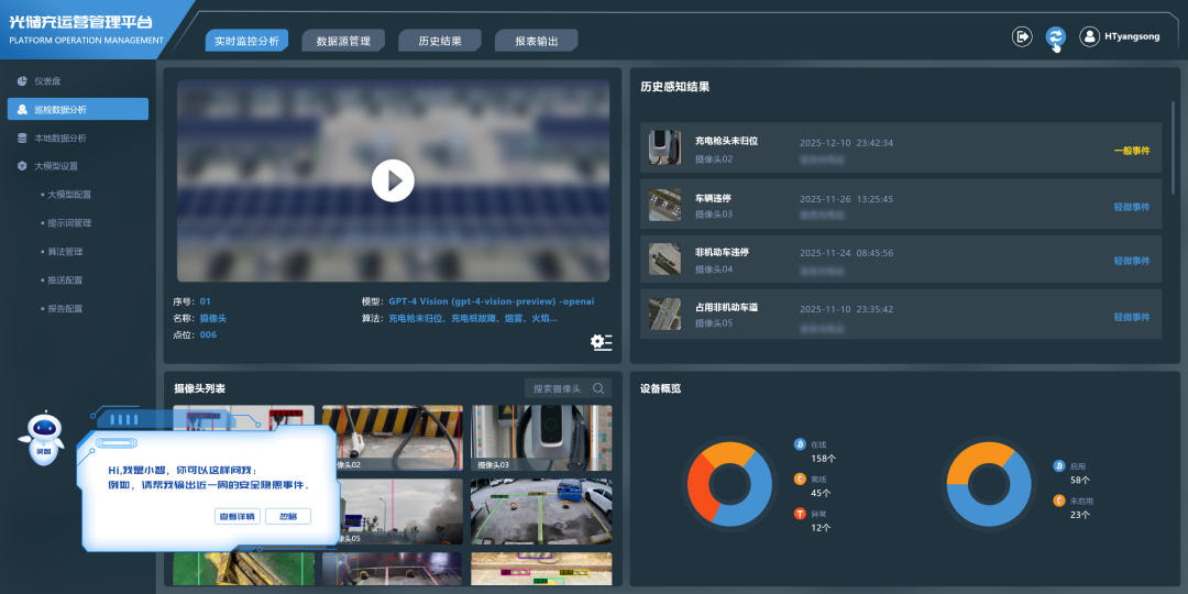 融合视频流与多维度数据,数字能源智能体实时感知人员车辆动态、设备状态及危险事件,联动车位引导提升效率;分级预警触发声光报警、设备停机等机制,事件全程留痕可追溯,实现 “事前预警、事中处置”。