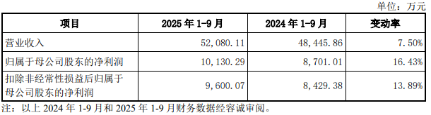 2025年1至9月,新广益营业收入为52,080.11万元,同比增长7.50%;归属于母公司股东的净利润10,130.29万元,同比增长16.43%;扣除非经常性损益后归属于母公司股东的净利润9,600.07万元,同比增长13.89%。