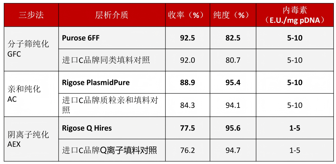 东富龙采用经典三步法进行质粒层析纯化,图表数据显示:亲和纯化步骤中,Tofflon Rigose PlasmidPure在保持高纯度的同时,收率也有显著优势。同时,东富龙层析介质内毒素控制水平均达到行业严格要求(≤10 E.U./mg pDNA),且在最终精纯步骤(AEX)后可进一步降低至1-5 E.U./mg pDNA的低水平,为质粒DNA的规模化、低成本、高质量生产提供了可靠的国产化纯化解决方案。(东富龙经典三步法与两步法对比的质粒层析案例可在往期推文回顾:质粒纯化工艺大比拼)