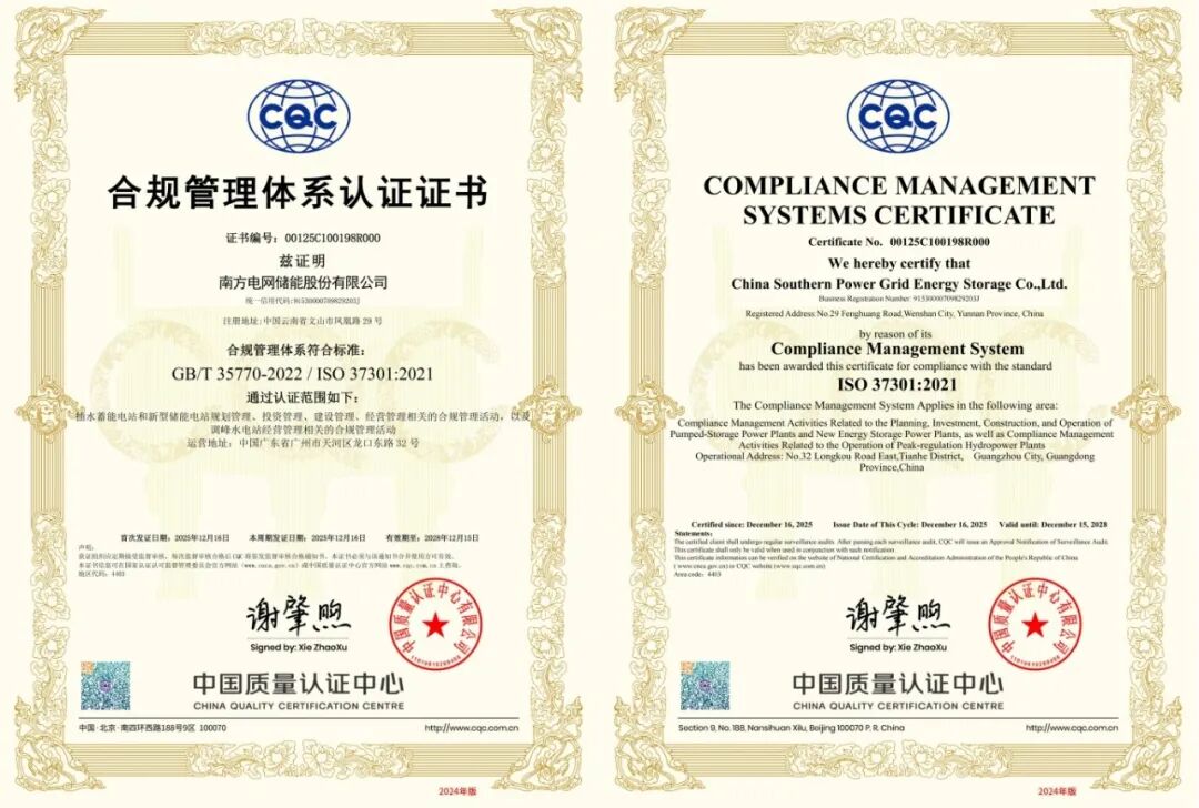 作为储能产业龙头企业,南网储能公司始终坚守合规经营底线,此次通过ISO37301合规管理体系认证,是公司在构建新型电力系统、服务“双碳”目标背景下深化管理变革、提升治理能力的重要成果。ISO37301合规管理体系的有效运行,将进一步强化南网储能公司在项目规划、投资建设、经营管理等关键环节的合规管控,助力公司有效应对市场风险、提升运营效率效益,同时为储能行业合规管理提供可复制、可推广的实践经验,彰显龙头企业的责任与担当。