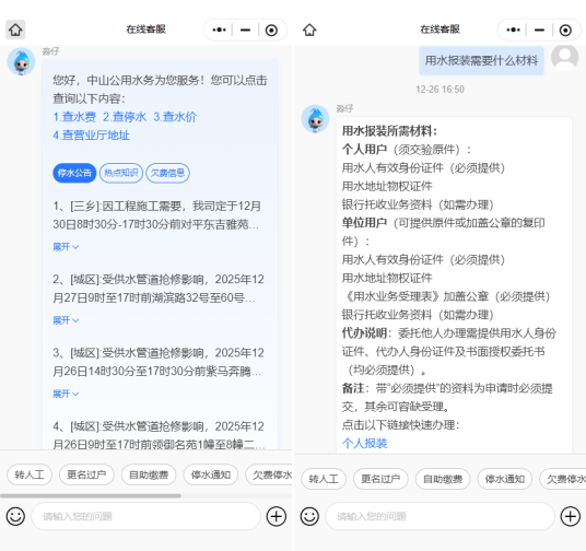 近日,公用集团下属中山公用(000685)水务在智慧水务建设方面取得关键进展,基于AI大模型研发的“在线AI客服”与“供水数据分析智能助手”正式内部上线运行,标志着公司在公共服务智能化与运营管理数据化方面迈出坚实一步,为水务行业数字化转型提供了可借鉴的实践路径。本次建设的核心是以人工智能开发平台为底座,构建“对外智能服务、对内数据赋能”的双轮驱动体系,全面提升水务运营效率与用户体验。