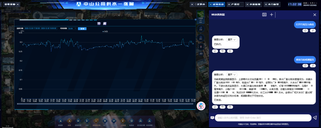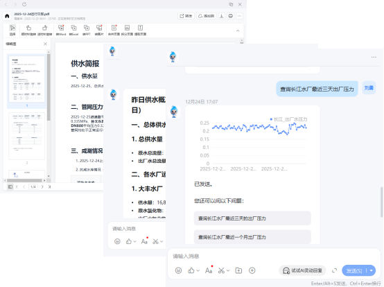全新上线的“水务智能助手”整合了生产调度、管网运行、水质监测等多源数据,构建了统一的智能分析平台。工作人员使用自然语言即可交互,系统能在10秒内提供精准结果。此外,系统基于AI大模型能力,可自动生成结构化运营日报并一键生成可视化图表,极大提升了数据工作效率。