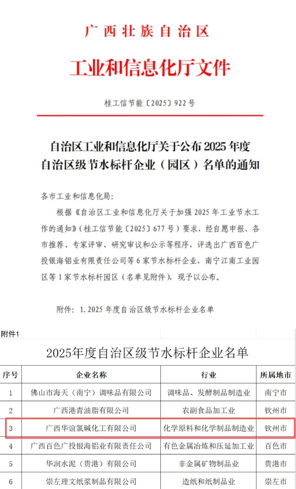 近日,广西壮族自治区工业和信息化厅发布了《2025年度节水型企业、节水型工业园区及节水标杆企业名单》。广西华谊氯碱化工(600618)有限公司凭借在水资源高效利用和绿色发展理念践行等方面的突出表现,成功入选2025年度“广西壮族自治区节水标杆企业”名单,成为行业内节水工作的示范单位。