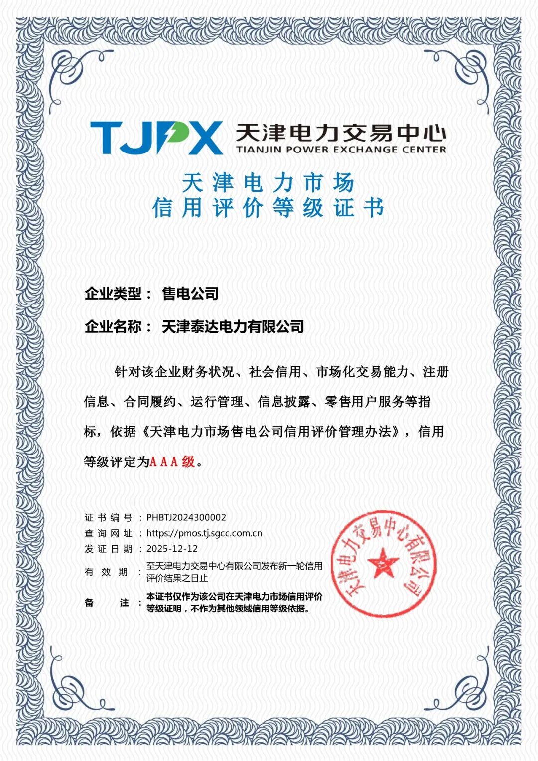 天津电力交易中心信用评价体系涵盖信用表现、履约能力、经营状况及市场行为等多个维度。泰达电力连续获评AAA级,充分彰显其在内部管理、风险控制与市场合规等方面的行业领先水平。