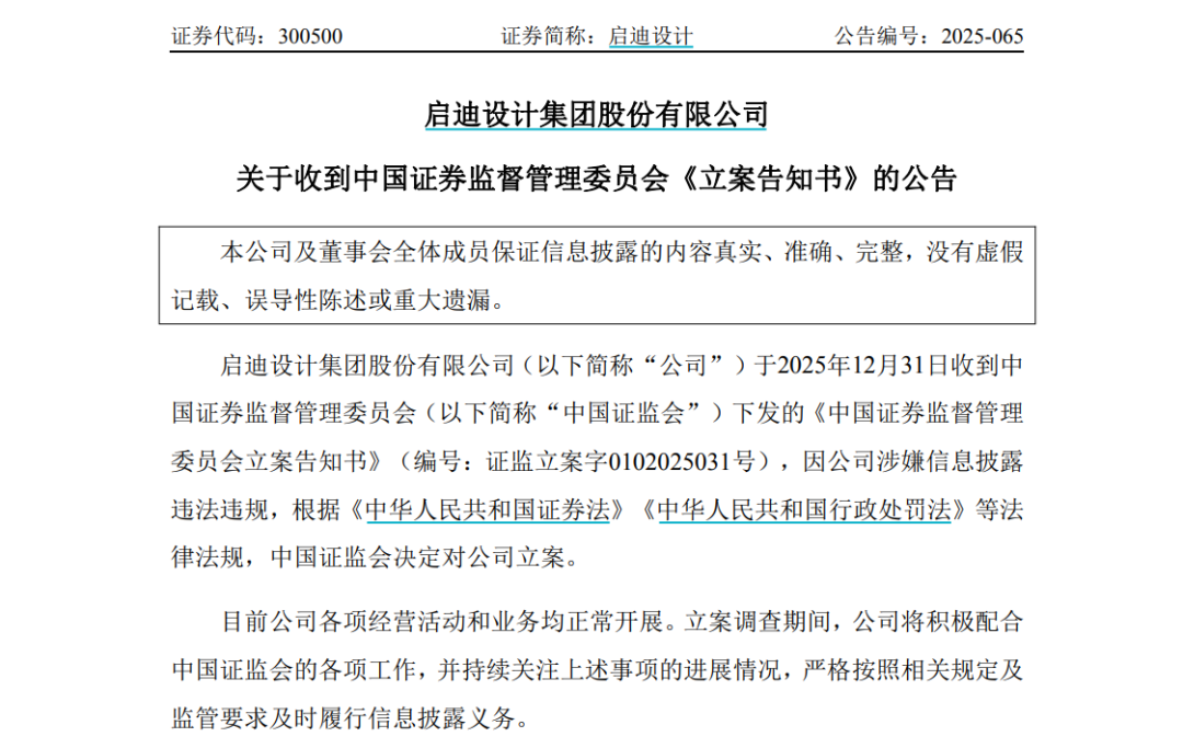 2025年的最后一天,启迪设计(300500)因涉嫌信息披露违法违规,被证监会立案调查。