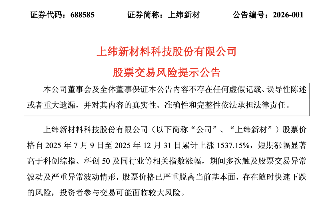 “目前,公司基本面未发生重大变化,但近期公司股票交易价格已严重脱离公司目前的基本面情况,公司股价存在随时快速下跌的风险。敬请广大投资者务必充分了解二级市场交易风险,切实提高风险意识,理性投资并注意投资风险。”上纬新材在公告中表示。