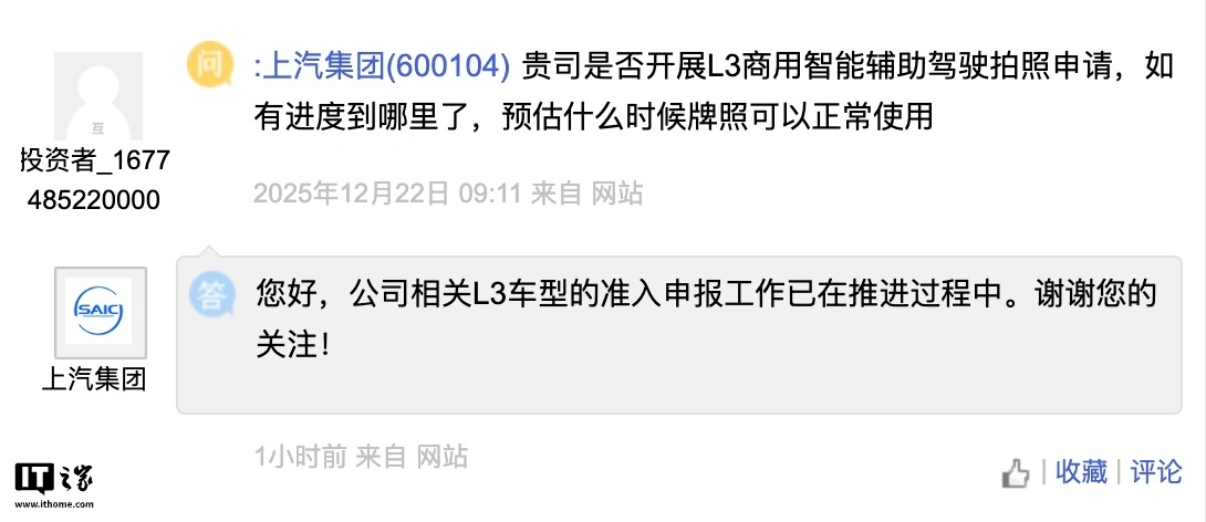 IT之家 12 月 31 日消息,今天下午,上汽集团(600104)通过“上证 e 互动”回应投资者问:公司相关 L3 车型的准入申报工作已在推进过程中。