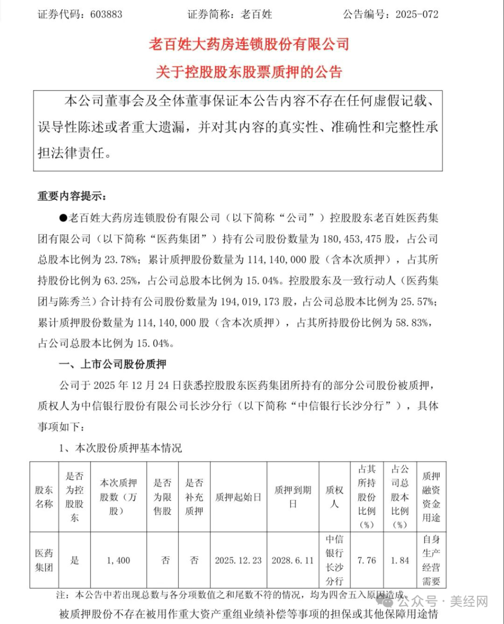 近日,老百姓大药房发布公告称,控股股东老百姓医药集团有限公司将其持有的1400万股公司股份质押给中信银行长沙分行。然而,这看似一次常规的融资操作背后,是控股股东深陷高比例股权质押循环的现实,也是公司盈利下滑、门店越开越多却越赚越少的不良循环。一次股份质押公告,由此串联起从资本棋局、财务表现到门店运营的连锁挑战,曾经的行业龙头到底怎么了?