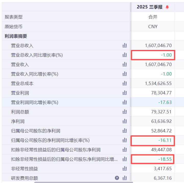 股价的持续疲软与高企的质押比例,共同指向了公司基本面的深层压力。2025年第三季度的财务报告提供了一个复杂而微妙的观察窗口。从表面数据看,第三季度单季似乎出现了一些积极变化。公司营收微增0.07%,归母净利润增长2.62%。然而,这抹短暂的亮色难以掩盖整体的暗淡基调。纵观整个前三季度,公司营收同比下滑1.0%,而归母净利润则大幅下降了16.11%。更值得关注的是扣除非经常性损益后的净利润,其同比降幅达到了18.55%,这个数字清晰地表明,公司核心业务的盈利能力仍在承受显著压力。