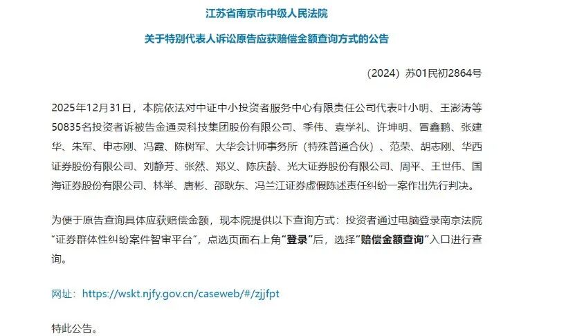 12月31日,南京中院对金通灵(300091)证券虚假陈述责任纠纷特别代表人诉讼案作出判决,4.3万余名投资者获赔7.7亿余元。