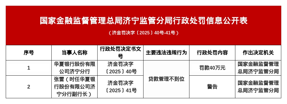 针对这一行为,国家金融监督管理总局济宁监管分局对其处以40万元罚款;对时任华夏银行股份有限公司济宁分行副行长的张雷,给予警告处罚。