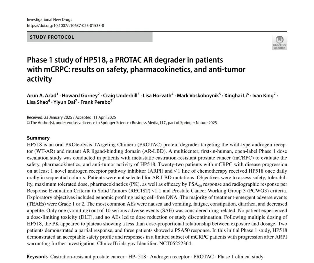 HP518澳大利亚临床I期研究成果发表于《Investigational New Drugs》