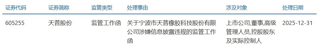 12月31日,上交所向天普股份(605255)下发监管工作函,涉及对象为上市公司、董事、高级管理人员、控股股东及实际控制人;处理事由为公司涉嫌信息披露违规。