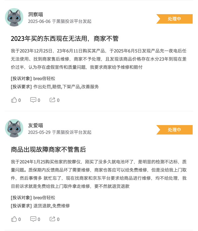 忽视、淡化对长久发展至关重要的研究开发,导致倍轻松产品很难能给消费者带来更好的产品体验——在黑猫投诉平台上,多有消费者对倍轻松肩颈按摩仪、护眼仪等产品存在质量缺陷、功能与宣传不符的投诉——甚至还因“拿来主义”陷入被诉侵害发明专利权。