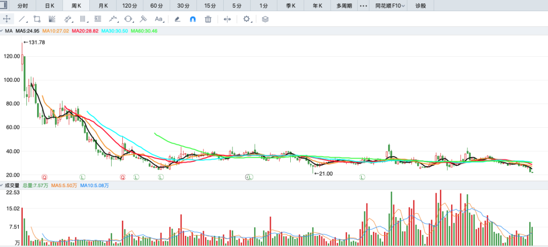 业绩持续承压,倍轻松的股价也是一路下行,已由上市时的最高131.78元/股跌至20元左右。截至12月31日收盘,倍轻松报收21.8元/股,跌幅0.37%,市值18.74亿元。
