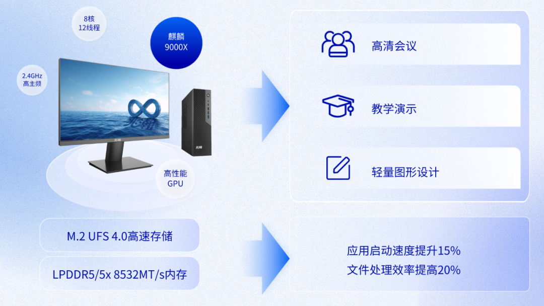 在信创终端迈向高质量发展的重要阶段,芯片的自主创新与卓越性能已成为衡量产品竞争力的关键所在。兆瀚D585x系列台式机搭载基于先进工艺打造的麒麟9000X处理器,具备8核12线程的强大配置与2.4GHz高主频,集成高性能GPU及智能处理单元,实现CPU、GPU与安全引擎的高效协同。这一架构不仅大幅提升数据传输效率,更让图形渲染、大型文档处理与安全运算实现无缝衔接,为用户带来流畅的全场景使用体验。
