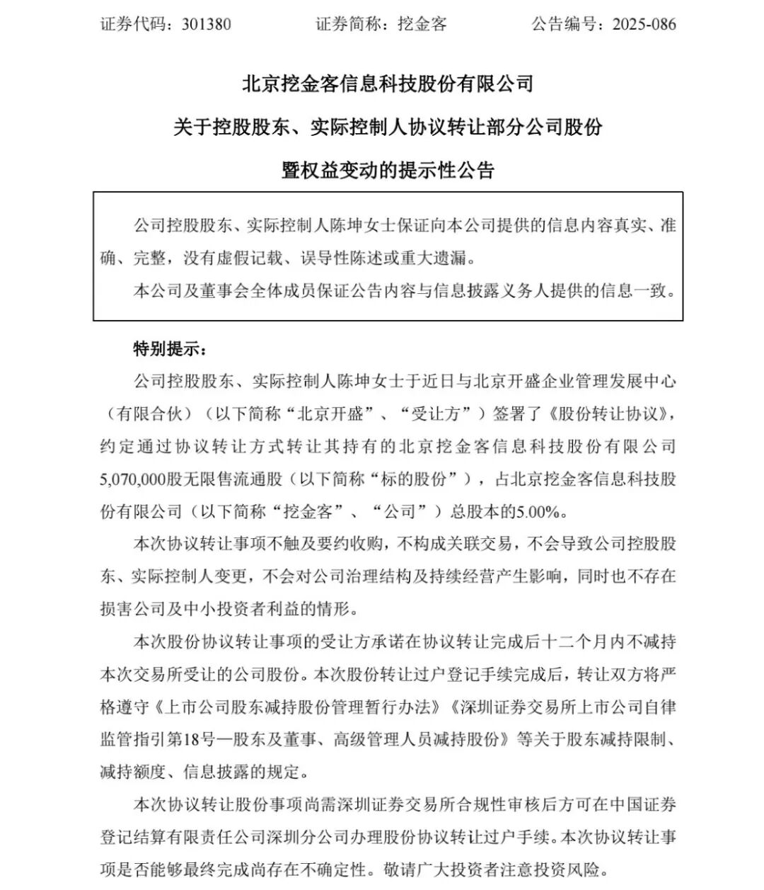 根据公告,公司近日接到控股股东、实控人陈坤的通知,为引入认可公司内在价值及未来发展前景的投资人,陈坤于2025年12月29日与北京开盛签署了《股份转让协议》,约定通过协议转让的方式,以31.67元/股的价格向北京开盛转让其直接持有的公司无限售条件流通股507万股(占公司总股本的5%),转让价款合计1.6亿元。