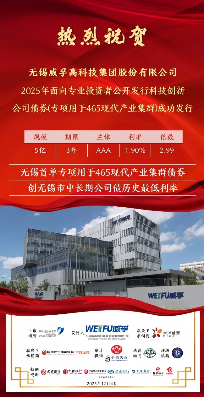 12月4日,无锡威孚高科(000581)技集团股份有限公司(以下简称“威孚高科”)在深圳证券交易所成功簿记无锡首单专项用于“465”现代产业集群债券“25威孚K1”,总规模5亿元,期限3年,票面利率1.90%,创无锡市中长期公司债历史最低利率。本期债券系威孚高科首次亮相债券市场,由天风证券(601162)担任牵头主承销商,国联民生(601456)证券、平安证券担任联席主承销商,全场认购倍数达2.99倍,充分体现了资本市场对威孚高科信用资质、经营实力与发展前景的高度认可与坚定信心。
