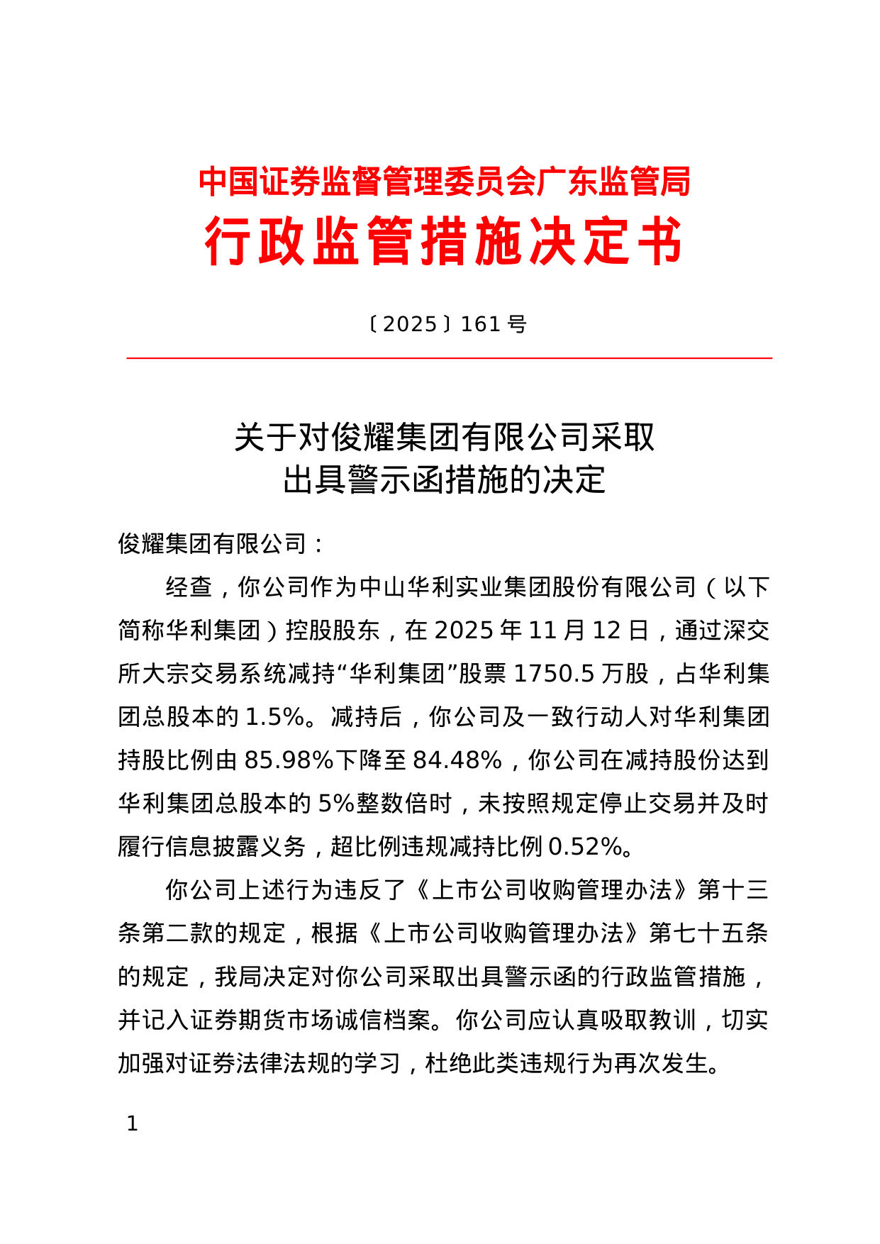 上述行为违反了《上市公司收购管理办法》的规定,广东证监局决定对俊耀集团有限公司采取出具警示函的行政监管措施,并记入证券期货市场诚信档案。