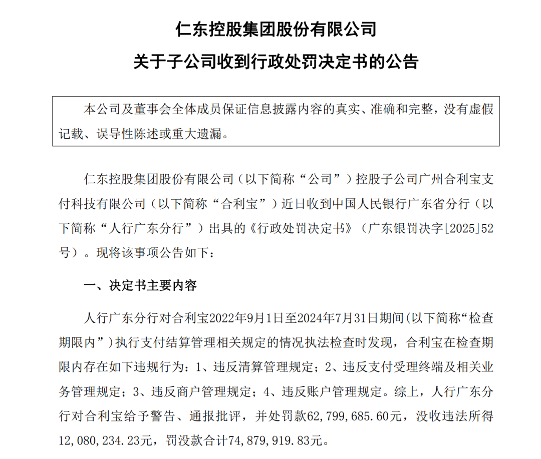 2025年12月31日晚间,*ST仁东公告称,控股子公司广州合利宝支付科技有限公司(以下简称合利宝)近日收到中国人民银行广东省分行(以下简称人行广东分行)出具的《行政处罚决定书》,因违反清算管理、账户管理等规定,被人行广东分行处以警告并罚没合计7487.99万元。