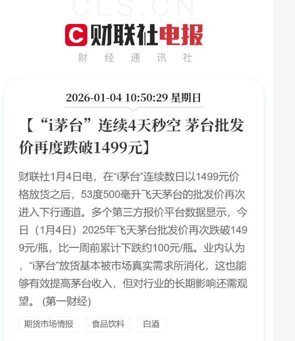 自2026年1月1日53度500毫升飞天茅台以1499元官方指导价登陆i茅台APP开启常态化发售以来,平台连续4天出现“秒空”盛况,与此同时,飞天茅台批发价再度进入下行通道,于1月4日跌破1499元关键关口。