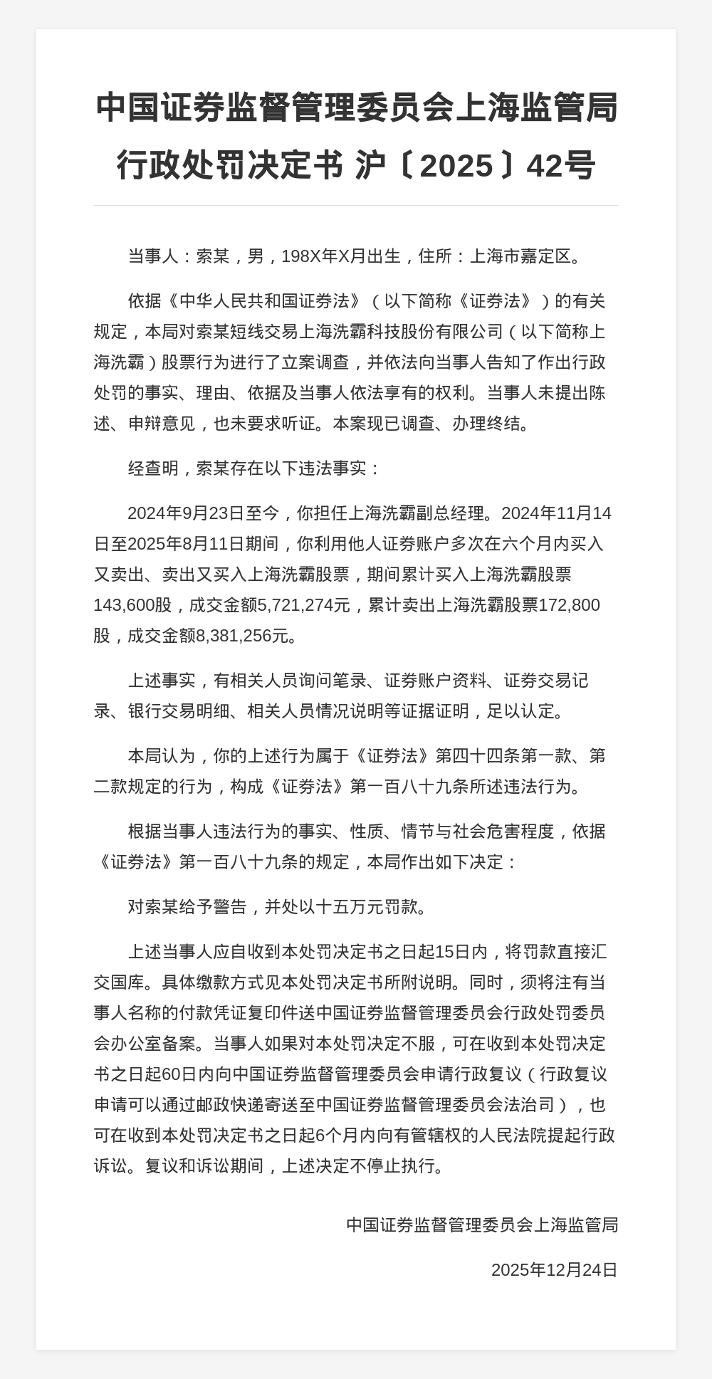 上海洗霸科技副总索某被罚15万,涉证券买卖违法